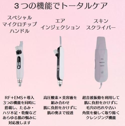 この革新的なハンドルは、EMS(筋肉刺激)・RF(ラジオ波)・導入(美容成分の浸透)の3つの機能を同時に搭載し、たるみ・ハリ不足・乾燥などのあらゆる肌悩みに対応します