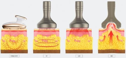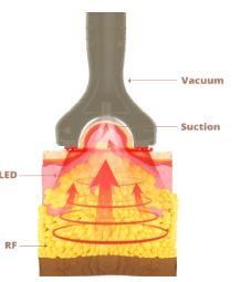 RFの熱エネルギーは、皮下脂肪層まで供給され、吸引とLED施術の機能を使用して脂肪減少と皮膚の引き締めを行います。